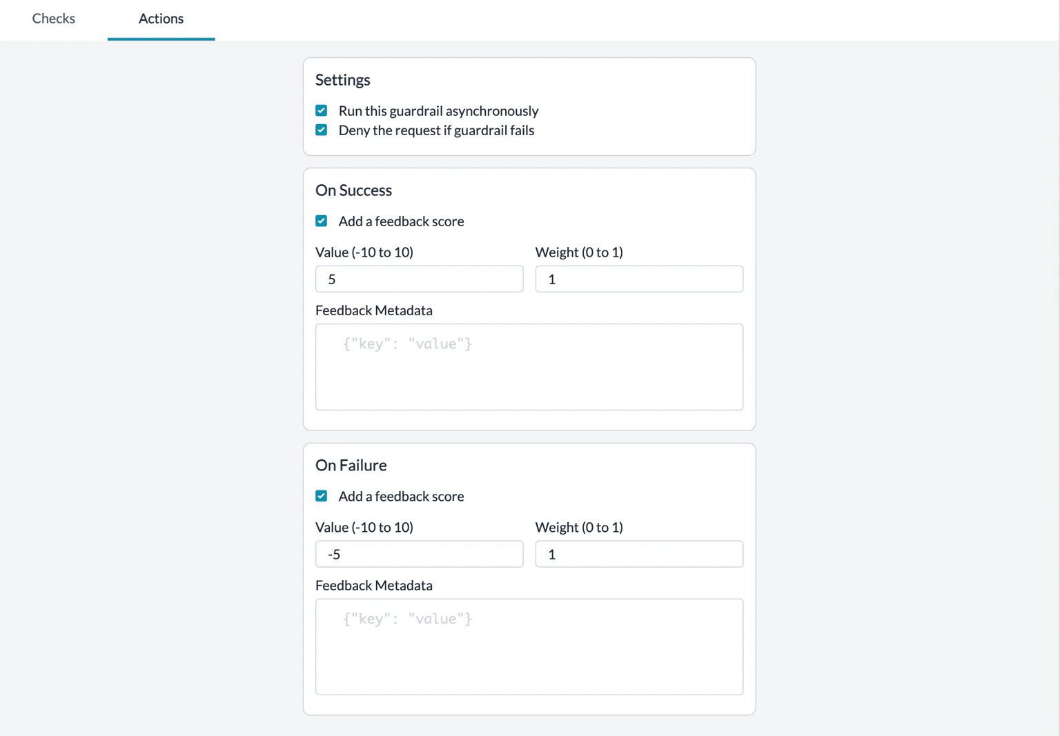 | On Success | Send Feedback | If all of the Guardrail checks PASS, append your custom defined feedback to the request | We recommend setting up this actionThis will help you build an “Evals dataset” of Guardrail results on your requests over time |